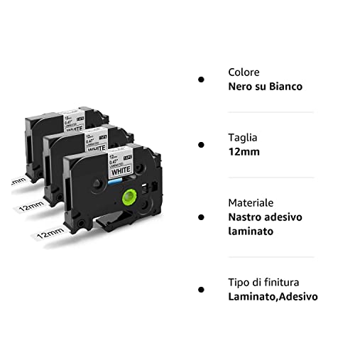 Nastro Cassette Etichette Suminey Compatibile In sostituzione di Brother P-touch TZe-231 12mm 0.47 Nero su Bianco Laminato Tape Cassetta per TZ Tape Ptouch PT-107B 1000 H105 H110 H100R 1005 1010 (3Pz)