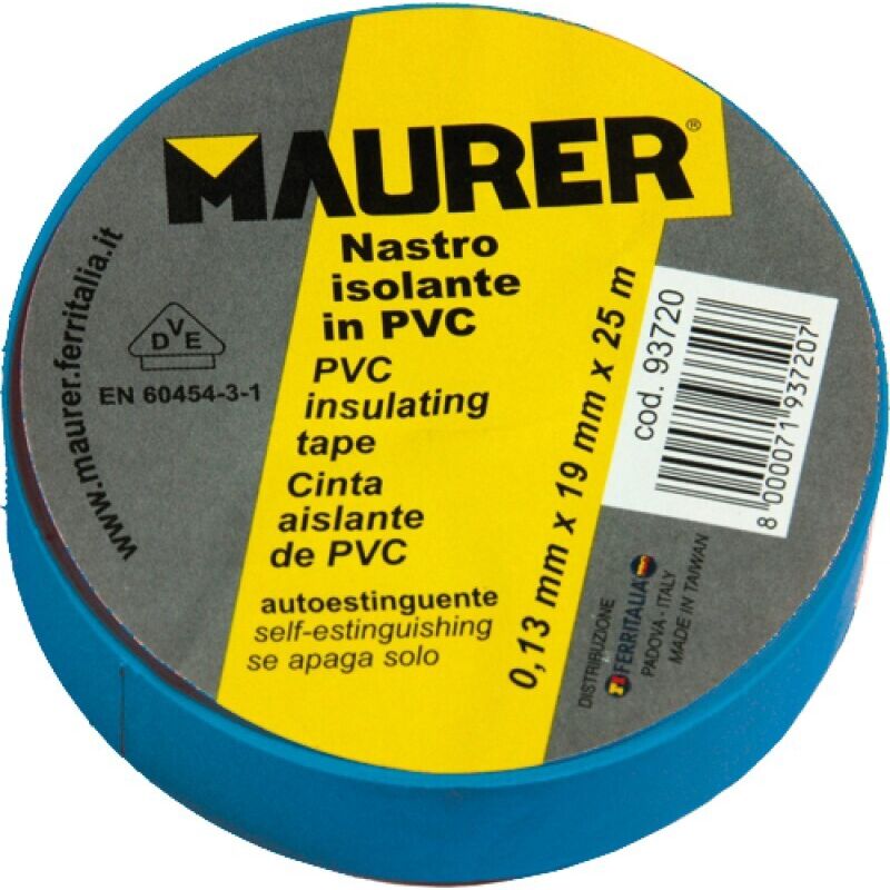 Nastro isolante in PVC colorato blu autoadesivo - Spessore 0,13 mm. - Autoestinguente - Utilizzo in campo elettrico - Norme EN 60454-3-1 Confezione: 10 PZ Lunghezza 10 mt. Larghezza 15 mm.