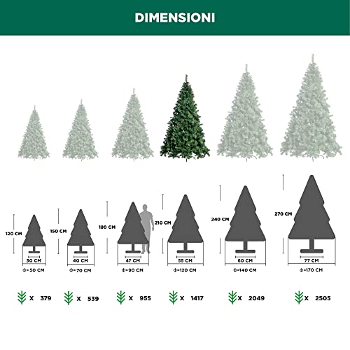 CARATTERISTICHE: I singoli rami lunghi e corti sono stati posizionati alternativamente in modo che l'abete acquisisca volume, naturalezza e risulti pieno in qualsiasi sua parte senza nessun "vuoto". I rametti sono realizzati per essere anticaduta e coprono quasi totalmente la base. Numero di Rami: 1420 Altezza Albero: 210 cm, Diametro della base: 120 cm. Lunghezza degli aghi: 2,5 - 5 cm. Lunghezza delle punte del ramo: 15 -20 cm.