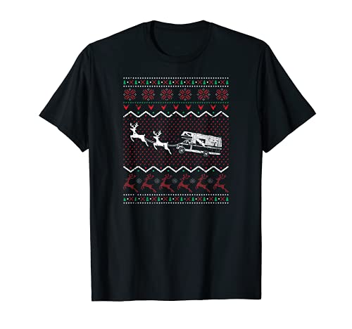Design natalizio con camper e renne. Abiti di Natale brutti e divertenti da uomo per le feste e durante la ricerca di offerte natalizie.