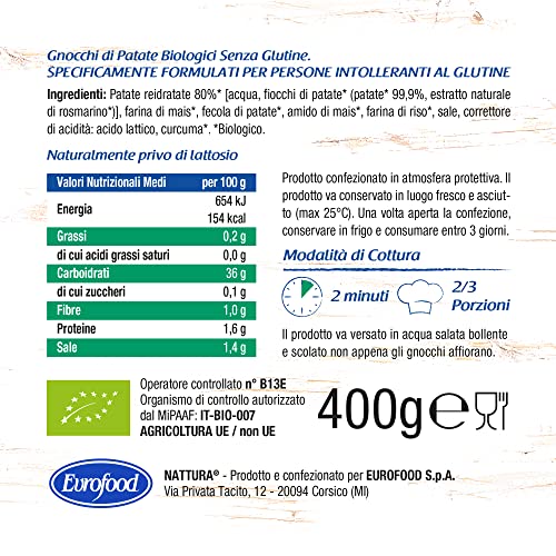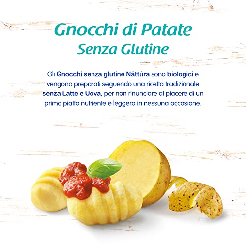 NATTURA, Gnocchi Biologici di Patate, Ideali per un'Alimentazione Sana, un Primo Piatto Equilibrato, Fonte di Fibre, Fosforo e Ferro, Senza Glutine, Senza Latte e Uova, Vaschetta 400 gr