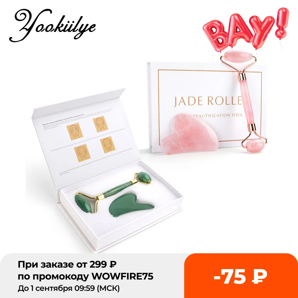 Natural Rose Quartz Jade Roller Gua Sha Scraper Set Facial Roller Massager Face Lifting Tighten Slimming for Neck Body Skin Care