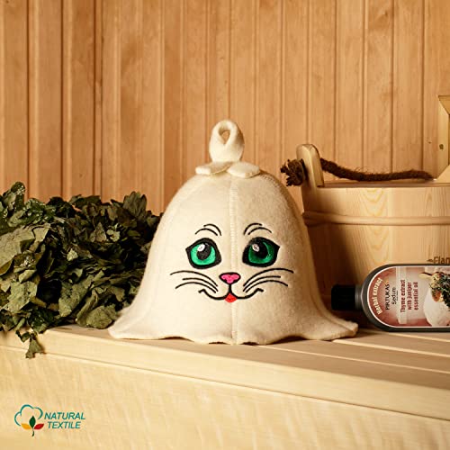 Natural Textile Capello da Sauna 'Sauna Kitten' Bianco - Cappelli in Feltro di Lana Biologico 100% - Proteggi la Tua Testa dal Calore - Guida eBook per Sauna in Inglese Incluso