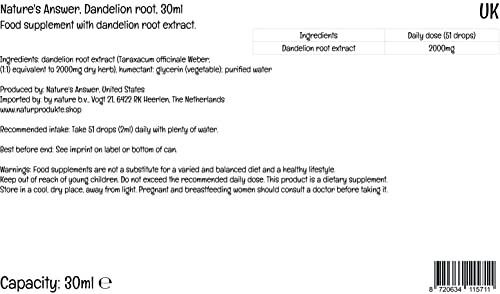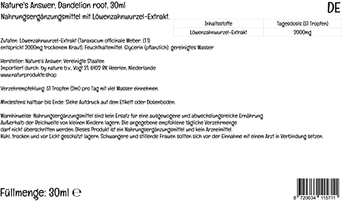 ALTO DOSAGGIO: Una dose, 51 gocce, di Nature's Answer Dandelion Root Extract contiene 2000mg di estratto di radice di dente di leone che puoi dare al tuo corpo ogni giorno