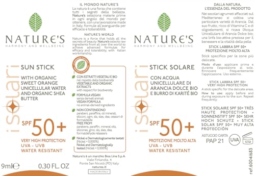 Nature's - iSolari, Stick Solare SPF50+, Protezione Solare Labbra, Protezione Solare Zone Delicate e Sensibili, Resistente All'Acqua, 9 ml