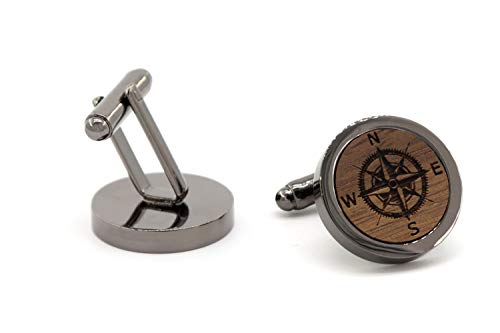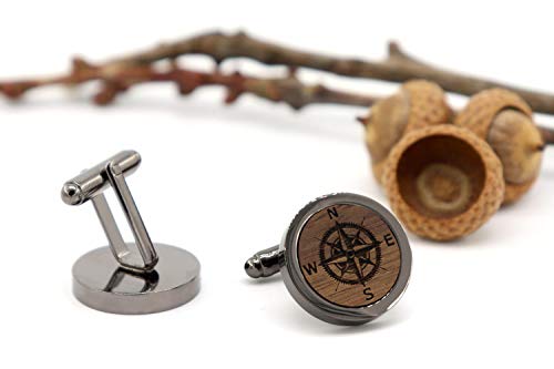 NaturSchatulle - Gemelli da uomo in legno con incisione, 1 paio di gemelli rotondi in argento nero e argento, per matrimonio e Bussola., colore: Nero, cod. N10251