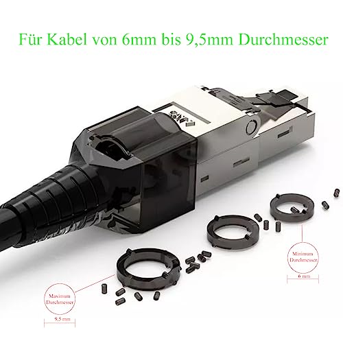 Il connettore di rete CAT7 CAT7a RJ45 supporta trasmissioni Gigabit - per frequenze operative fino a 1000 MHz CAT 6a, CAT 7, CAT 8.1, T568A, T568B, PoE plus - Cavo riduttore adatto per diversi cavi Ø 6,0 - 9,5 mm - per cavi patch e di posa