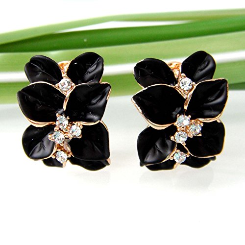 Navachi Omega Orecchini placcati in oro da 18 k, smaltati, in cristallo, a forma di fiore con foglie e 18ct base metallo placcato oro, colore: Black, cod. HB6-2007-1