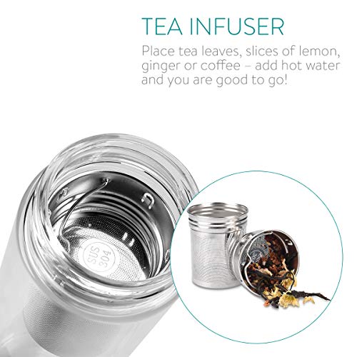 DETTAGLI: 1x borraccia termica in vetro borosilicato infrangibile da 0,5l (7x25,5cm), 1x setaccio in acciaio con tappo, 1x coperchio in bambù, 1x custodia in neoprene. Resistenza termica compresa tra -20°C a 150°C.