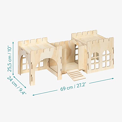 BILOCALE: il castello ha 2 stanze con porte e finestre grandi collegate da un ponte in legno con scale. Puoi sistemare la tana per conigli nani sul tappeto in salotto. Ideale anche per cincillà, cavie peruviane, criceti, porcellini d'India e topi.