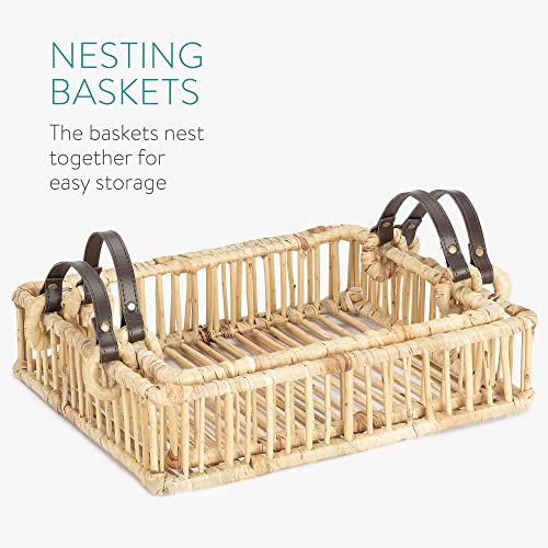 DETTAGLI: il cesto piccolo misura 32x26x8,5cm e la scatola grande è di 37x31x8,5cm. In salice naturale e giacinto d'acqua, ogni cestino resistente ha 2x maniglie in simil pelle che ne facilitano il trasporto.