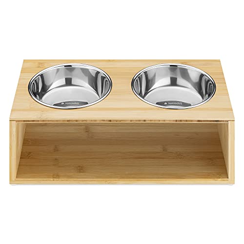 Navaris 2X Ciotole Gato Cane in Acciaio Inox Ø14x4cm 1x Supporto Legno - Stand Portaciotole 35x18x12cm - Alzaciotole Cibo Secco e Umido Gatti e Cani