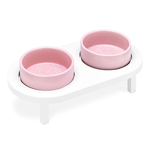 RESISTENTE E FACILE DA PULIRE: lo stand per ciotola è realizzato in legno di pino bianco e misura 32,4 x 17,1 x 6,35 cm. Ogni ciotola per gatti in ceramica rosa di alta qualità misura Ø 11 x 5,1 cm ed è lavabile in lavastoviglie.