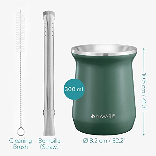 Navaris Kit Completo 1x Bicchiere Yerba Mate Mug 1x Cannuccia Bombilla 1x Spazzolino - Tazza Tè Argentino Acciaio Inox Ø8,2x10,5cm - Set Verde 300ml