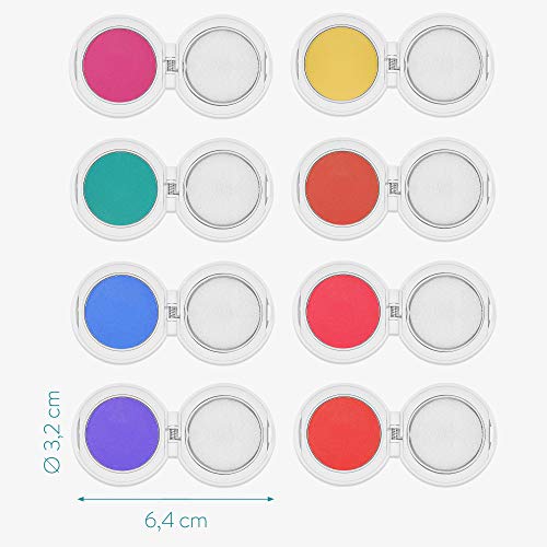 DETTAGLI: inclusi 8 colori - blu, verde, rosso, viola, rosa, arancione, giallo, marrone / misure: 32x32mm / peso 17g / materiali: PS, spugna, acciaio inossidabile, cosmetico, PVC. Per bimbi a partire dai 6 anni.