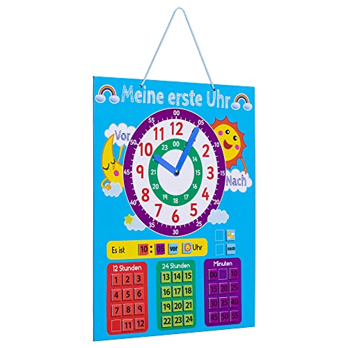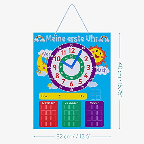 CHE ORA È?: con il suo primo orologio interattivo ogni bambino può imparare a leggere e scrivere l'ora in lingua tedesca come un vero deutsches Kind. Il cartellone orario con lancette facilita l'apprendimento di ore e minuti.