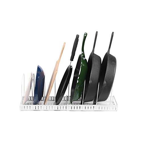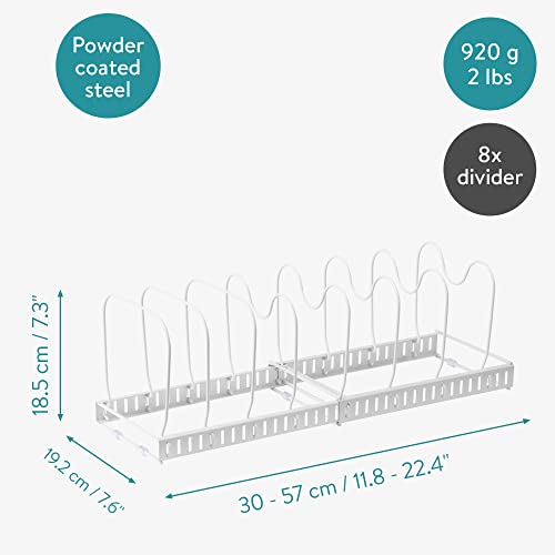 DETTAGLI: porta padelle, coperchi e pentole / 8 divisori / espandibile da 31,4 a 57 cm / dimensioni: 30-57 x 19,2 x 18,5 cm / peso: 920 g.