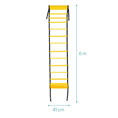 ATTREZZATURA SPORTIVA: la confezione comprende una agility ladder regolabile (lunghezza: 6 metri) e una borsa per il trasporto. Quando non in uso, la scaletta portatile si ripiega e viene tenuta insieme da due chiusure a strappo.