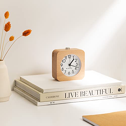 Navaris Sveglia da Comodino in Legno Naturale - Orologio da Tavolo Quadrato con Snooze - Sveglia Analogica Silenziosa Stile Vintage - Quadrante Bianco