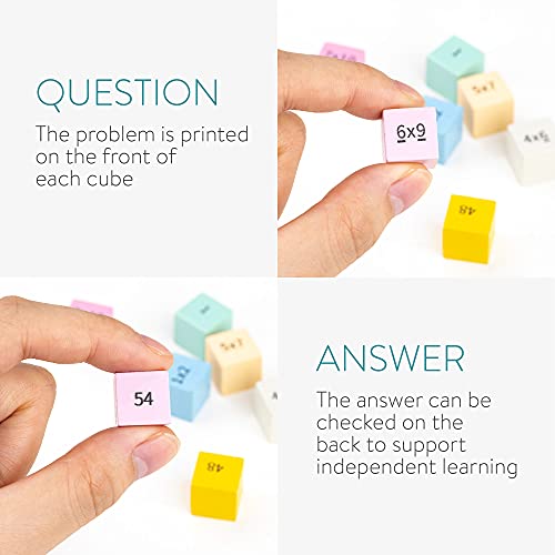 DETTAGLI: misure: 19x19x2cm / materiale: legno di pino / peso: 300g / 100x dadi colorati con numeri. I risultati delle tabelline sono riportati sul retro di ogni cubo.
