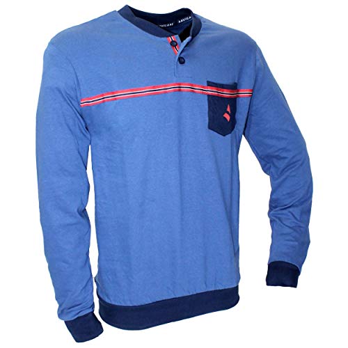 Fresco pigiama Uomo prodotto dalla Navigare in cotone Jersey, composto da maglia serafino maniche lunghe con polsini elastici, elastico in vita e taschino al petto e da pantalone abbinato con polsini elastici e tasca posteriore.
