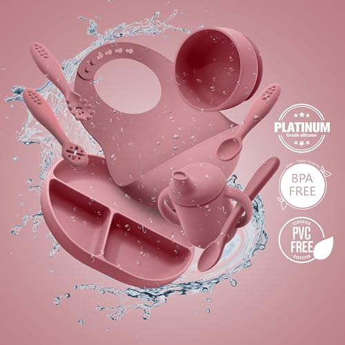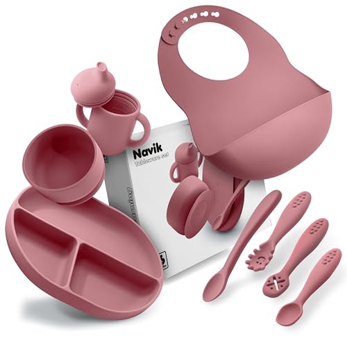 Navik | set pappa svezzamento | piatto svezzamento con ventosa per bambini | bicchiere bambino | cucchiaio e ciotola in silicone | rosa