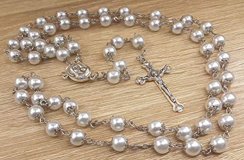 Splendido rosario con perle bianche di vetro imitazione, con collana a croce di Gesù realizzata con la massima qualità e artigianalità, al fine di rappresentare rispettabilmente il simbolo della religione cristiana.