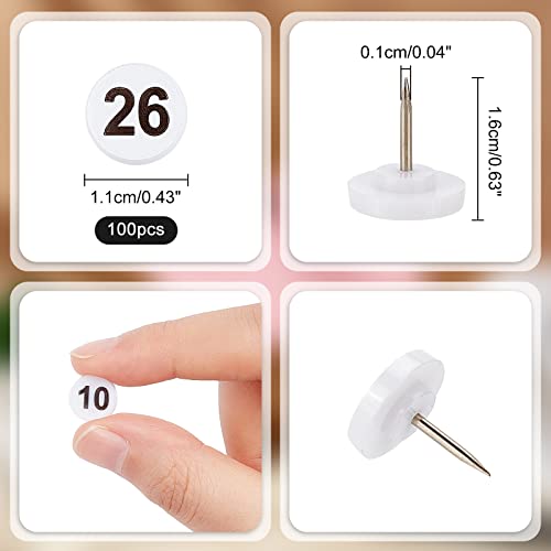 100 Numeri sequenziali: le puntine piatte bianche sono stampate con numeri neri, alto contrasto e facile da marcare, numeri compresi tra 1 e 100, abbastanza per le tue necessità quotidiane. La dimensione del perno è di circa 11 mm di diametro, 16 mm di lunghezza, ago:1mm.
