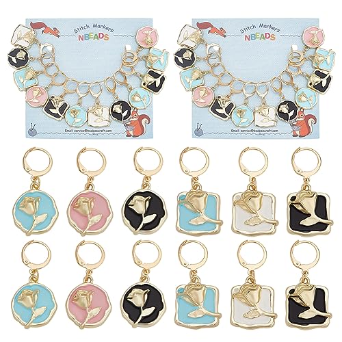 NBEADS 24 pz Rosa Ciondolo, Piatto Rotondo/Quadrato Smalto Lega Punto Uncinetto Segnapunti 304 Chiusura in Acciaio Inossidabile Chiusura Punto Segnapunti per Maglieria Tessitura Creazione di Gioielli