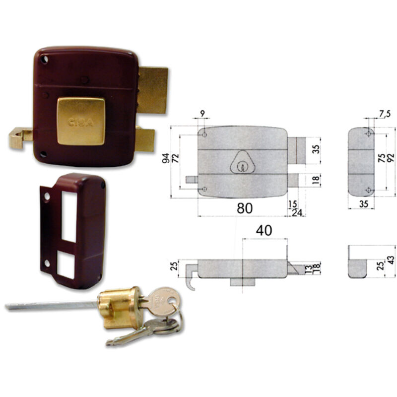 Serratura in acciaio da applicare per porte in legno, scrocco e catenaccio completo di cilindro legno Caratteristiche tecniche: • Scatola e bocchetta in acciaio verniciate color rosso amaranto • Scrocco e catenaccio in ottone • Tirante e pomolo in ottone Dotazione: • Bocchetta • 3 chiavi art. 1.01070.10.1 • Viti fissaggio