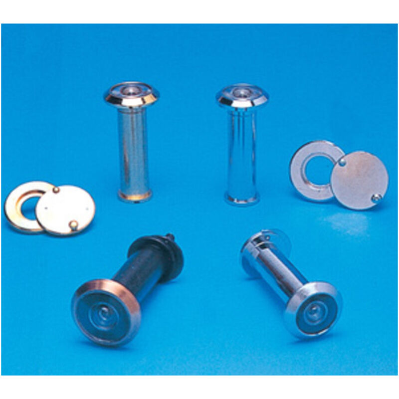 In ottone, completo di rondella posteriore. Visibilità 180° Diametro 14 mm Per porte corazzate. Lenti sintetiche di qualità . Lunghezza mm 50÷82 Finitura cromo satinato