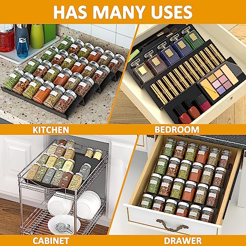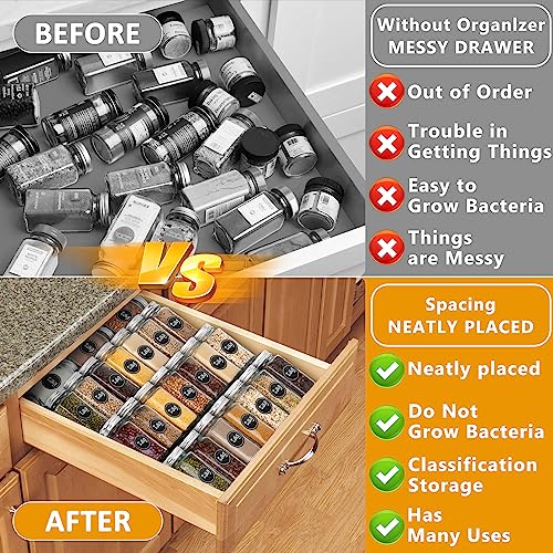 【Può Essere Combinato in Qualsiasi Modo】Il porta spezie è composto da 6 misure grandi e 2 piccole rimovibili, perfette per bottiglie di spezie di dimensioni diverse. A differenza di altri portaspezie monoblocco non rimovibili, i nostri portaspezie possono essere combinati in qualsiasi modo per estendere le spezie alla larghezza necessaria per adattarsi perfettamente al cassetto. Dimensioni completamente estese: L60,8 x L44 x H3,8 cm.