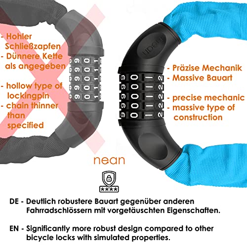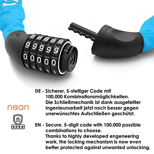 Nean Lucchetto con combinazione, con catena in maglie in acciaio, per bicicletta e moto 6 x 900 mm, (neon blu)