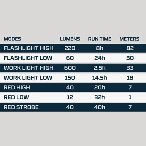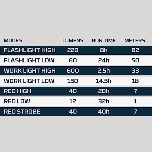 7 modalità di illuminazione: torcia alta (220 lumen): 8 ore/82 metri, torcia bassa (60 lumen): 24 ore/50 metri, luce di lavoro alta (600 lumen): 2,5 ore/33 metri, luce di lavoro bassa (150 lumen): 14 ore 30 minuti/18 metri, luce rossa per attività alta. (40 lumen). uomo): 20 ore / 7 metri, luce rossa compito basso (12 lumen): 32 ore/1 metro, rosso stroboscopio (40 lumen): 40 ore / 7 metri