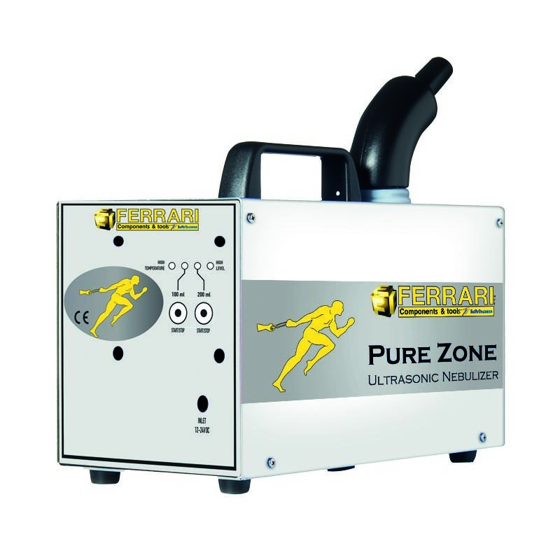 Il nebulizzatore ultrasonico professionale Pure Zone è una macchina avanzata per il trattamento antibatterico ad ultrasuoni, progettata per sanificare efficacemente sia gli impianti di condizionamento che gli ambienti. CARATTERISTICHE: Alimentazione: 220V - 50/60 Hz e 12V con adattatore accendisigari Durata ciclo: 12/20 minuti a 20°C Temperatura di utilizzo: 0°C ÷ 60°C Tasso di nebulizzazione: 500 ml/h Portata ventola: 34 m³/h Dimensioni: L 300 mm x P 150 mm Il nebulizzatore ultrasonico Pure Zone offre una soluzione pratica ed efficace per mantenere gli ambienti e i sistemi di condizionamento puliti e privi di batteri. Funzionamento: Basta versare il liquido nella macchina e questa genera istantaneamente una nebulizzazione che sanifica l'aria e tutte le superfici circostanti. Un ciclo completo di trattamento igienizzante con Pure Zone dura circa 30 minuti a 20°C e la macchina si arresta automaticamente quando raggiunge il livello minimo di liquido. Dopo il trattamento, è necessario