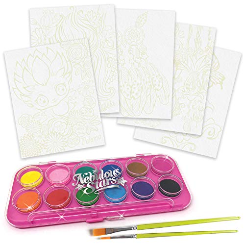 La pittura ad acquerello si deposita solo sulle aree da colorare e lascia apparire dei motivi bianchi glitterati che brillano al buio!