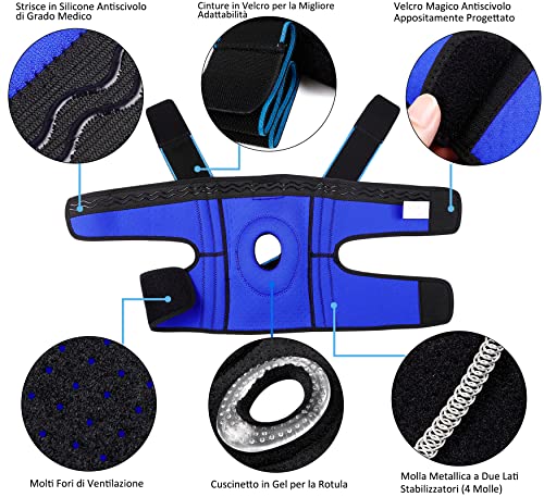 Sollievo efficace e sostegno - componenti come cuscinetti in gel per rotula stabilizzatori laterali a molla, strisce in silicone antiscivolo e tessuto di compressione elastico possono ridurre notevolmente la pressione del ginocchio e aiutare il menisco a recuperare. Avvolgi intorno alla rotula per migliorare la stabilità del ginocchio, rilassa i tendini e previene la tensione muscolare. Allevia il dolore ACL, LCL, MCL e PCL, previene lesioni al legamento, lussazioni, ecc.