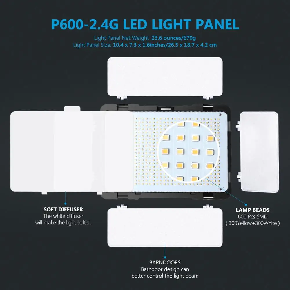Neewer 2-Pack 2.4G LED Light with 2M Stand Bi-color 600 SMD CRI 96+ LED Panel/Barndoor/LCD Display Video Lighting Kit for Studio
