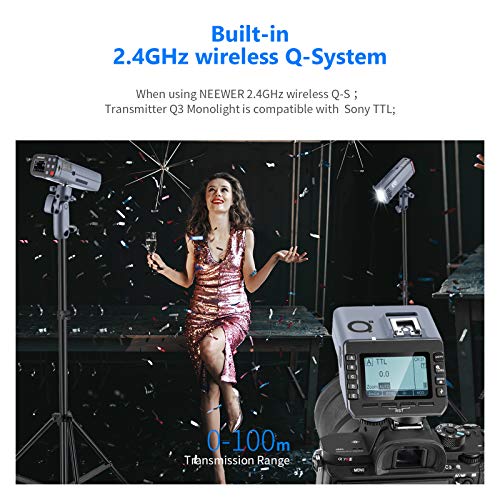 2,4G WIRELESS FLASH TRIGGER: Quando è usato il trigger 2,4G wireless Q-S, lo strobo Q3 è compatibile con le fotocamere Sony TTL. Il wireless flash trigger TTL Q-S dispone di 5 gruppi e 32 canali, supporta TTL Autoflash, sincronizzazione a velocità alta 1/8000, multi-flash, flash manuale, compensazione dell'esposizione flash, controllo di lampada di modelizzazione di gruppo, zoom di gruppo e regolazione di valore di uscita di tutti i gruppi nello stesso tempo. Le batterie NON sono incluse!