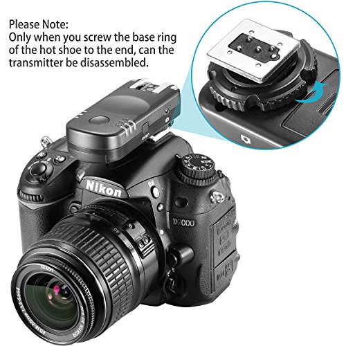 RICETRASMETTITORE PRATICO: È un dispositivo indispensabile per attivare la fotocamera e il flash nello stesso tempo per avere le immagini di qualità elevata. (ATTENZIONE: Solo quando la ghiera nella parte inferiore è completamente allentata, si può smontare il ricetrasmettitore.)