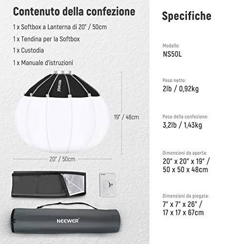 NEEWER 50cm Softbox Lanterna a Sgancio Rapido, Diffusore di Luce a 360° con Gonnellino, Attacco Bowens per Luce Video CB60 CB100 CB150 Compatibile con Aputure Luce 600d Amaran 60x Godox SL60W NS50L