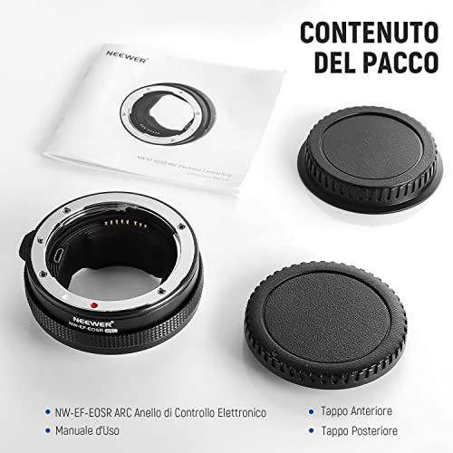 Contenuto della confezione: 1 adattatore di fissaggio NEEWER NW-EF-EOSR ARC, 1 manuale utente (lingua italiana non garantita), 1 tappo anteriore, 1 tappo posteriore