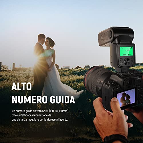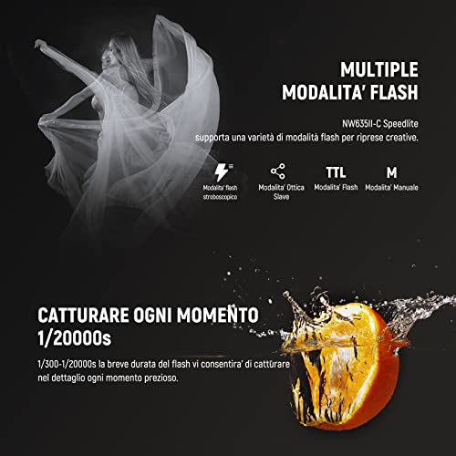 [Varie Modalità Flash] Questo NW635II-C speedlite supporta le modalità TTL, Manual, Optical Slave S1/S2 & flash stroboscopico, così come la compensazione dell'esposizione flash e le altre funzionalità. Il numero guida elevato GN58 (ISO100, 180mm) permette l'illuminazione da una distanza maggiore. Lo schermo LCD chiaro mostra tutte le informazioni necessarie per le precise impostazioni del flash.