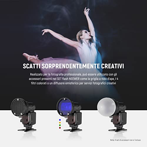 [Leggerezza & Trasportabilità] Usare 4 batterie alcaline AA (NON incluse) o 4 al nichel metallo idruro (NON incluse) per alimentare il flash, il quale è leggero e quindi viene montato direttamente sulla fotocamera senza aggiungerci nessun peso extra. La custodia protettiva tiene il flash al sicuro durante il trasporto.