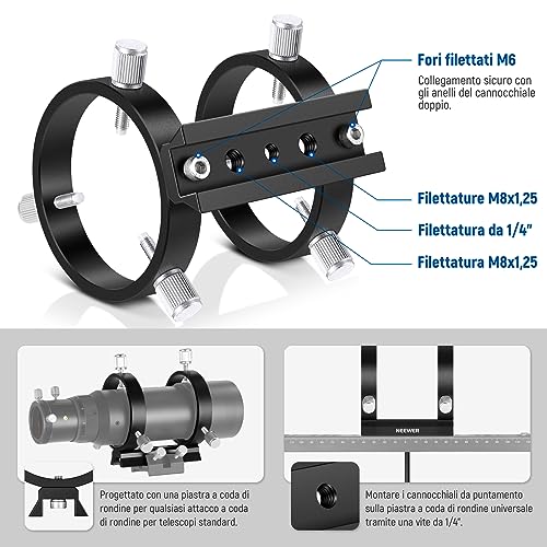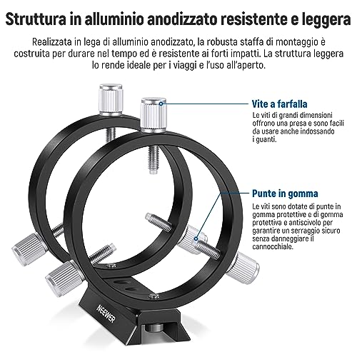 NEEWER Set di Anelli Regolabili per Telescopi con Piastra a Coda di Rondine per Telescopi con Diametro del Tubo da 43mm-68mm/Telescopi di Guida,Staffa Telescopio A Doppio Anello+Filettatura 1/4",LA-07