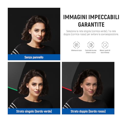 【Cornici Circolari e Rettangolari】Due telai circolari (punti) da ø6" (16cm) e due telai (dita) rettangolari da 4" x 14"(10x35,5cm) sono adatti per ambienti di ripresa più esigui. La loro funzione è quella di regolare con precisione la posizione della luce e prevenire i riflessi, consentendo ai fotografi di controllare con precisione la luce, generando ombre scure e luci brillanti
