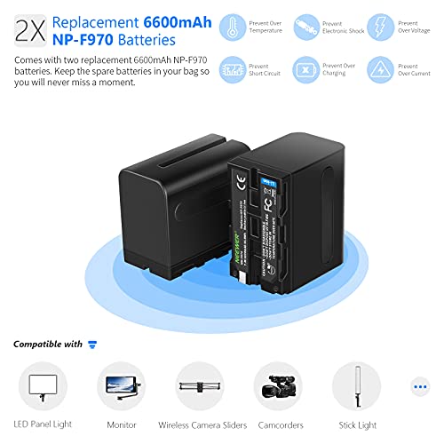 NEEWER Caricabatterie Rapido Dual USB con 2 Batterie NP-F970 di Ricambio da 6600 mAh, Compatibile con Sony NP-F970 F960 F950 F770 F750 F570 F550, Handycam e NEEWER Led Light, Monitor