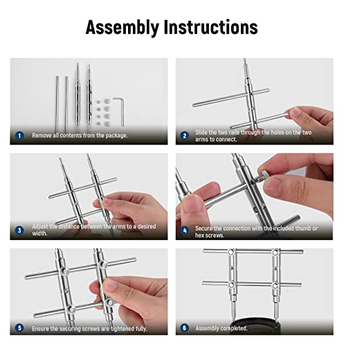 【Distanza regolabile tra le punte】 Il design dritto e perpendicolare rende lo strumento di rimozione dell'obiettivo più stabile e rigido con le sue braccia che guidano su due binari. Regola facilmente la distanza tra le due punte allentando le viti e facendo scorrere i bracci, regolabile da 5 mm a 100 mm