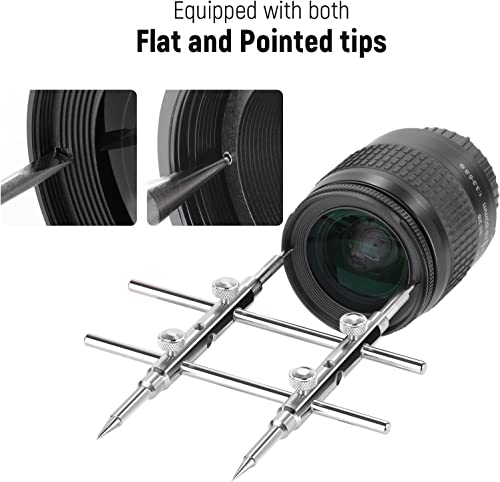 【Punte a doppia faccia appuntite/piatte】 Questa chiave per lenti presenta sia punte appuntite che punte piatte per adattarsi a tacche di fori standard e rispettivamente tacche scanalate sugli anelli di fissaggio della lente. Quattro viti incluse per bloccare saldamente le braccia e le guide con maggiore stabilità