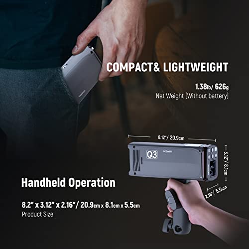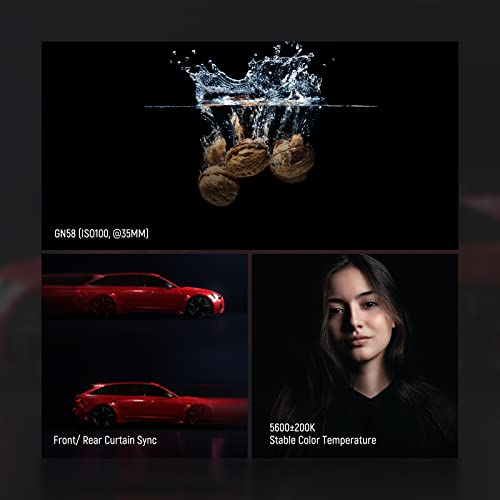 [Funzioni Potenti] Il modello Q3 è un flash potente con alto numero guida di 58 (ISO100, @35mm), potenza regolabile di 200W in 8 fasi da 1/128 a 1/1 e durata di flash breve di 1/15380s. La batteria da 14,4V 3200mAh offre 500 lampi flash a potenza piena con ricarica veloce in 0,01-1,8 secondi.